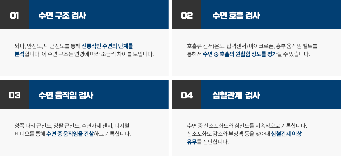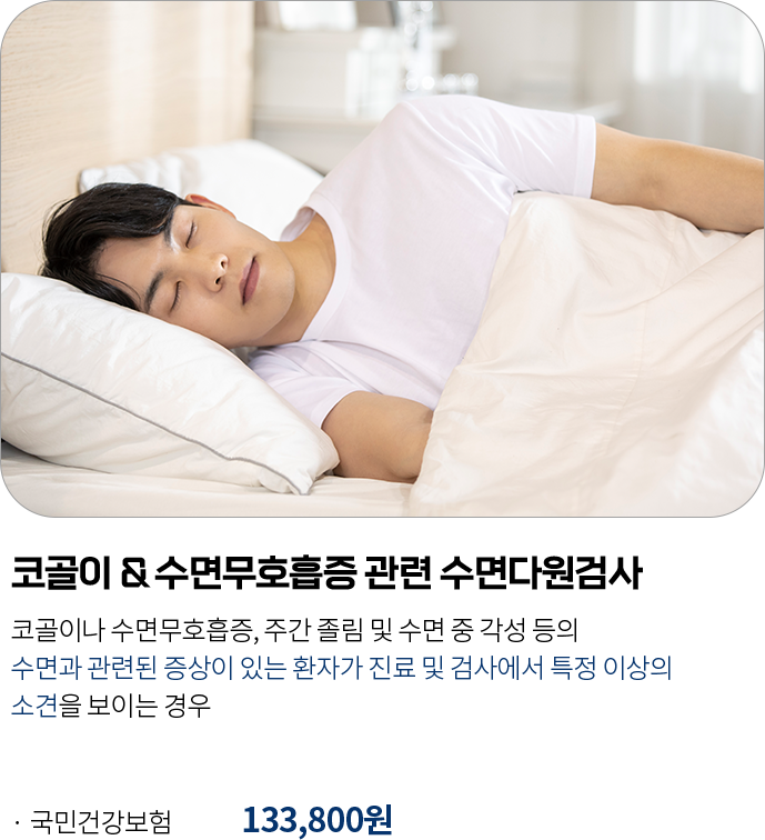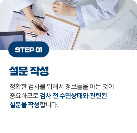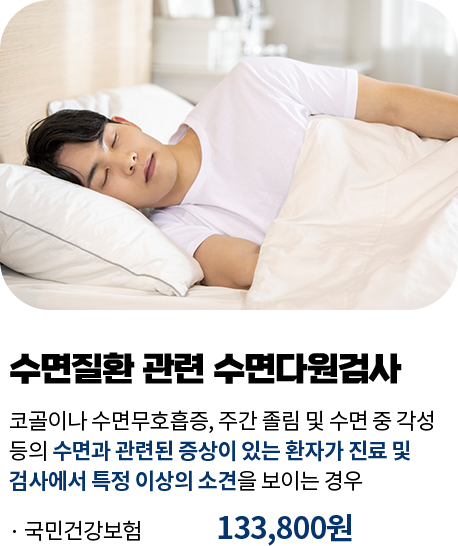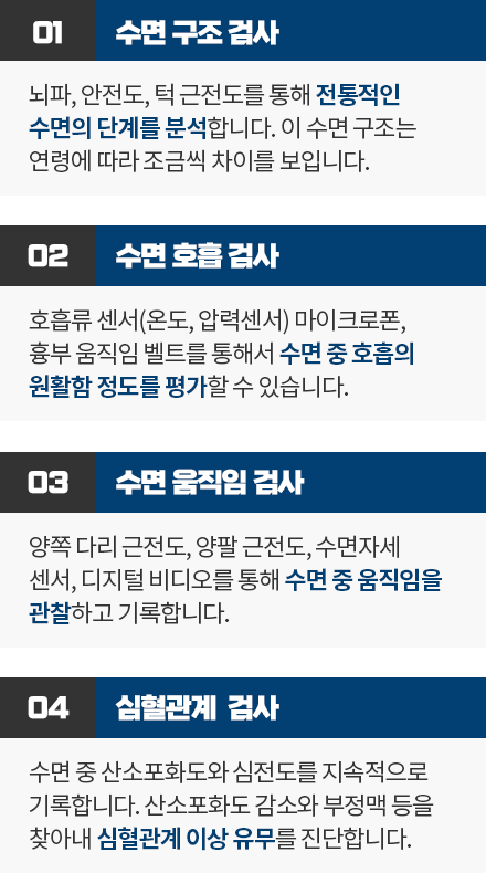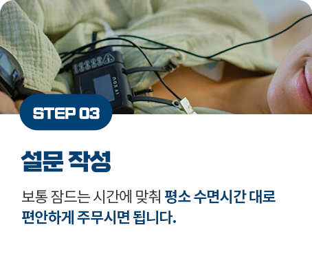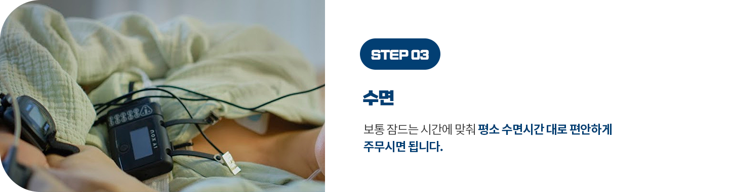 검사실에서 하룻밤 잠을 자면서 하는 검사이기 때문에 개개인의 기존 취침 시간에 맞춰 원하는 시간 언제든지 가능합니다.