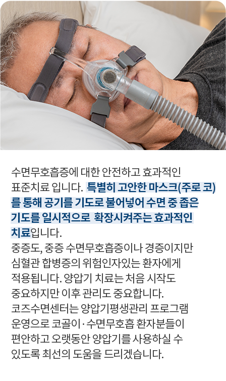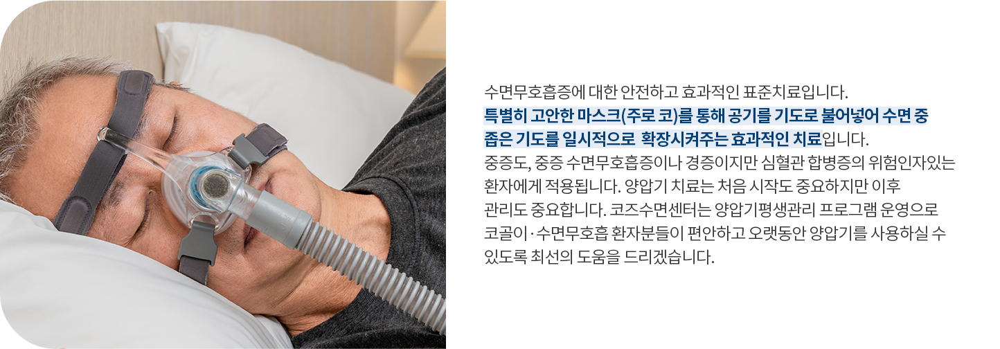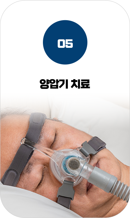 수면중 공기 압력을 불어 넣어 좁아진 기도를 일시적으로 확장해주는 양압기를 처방해드립니다.