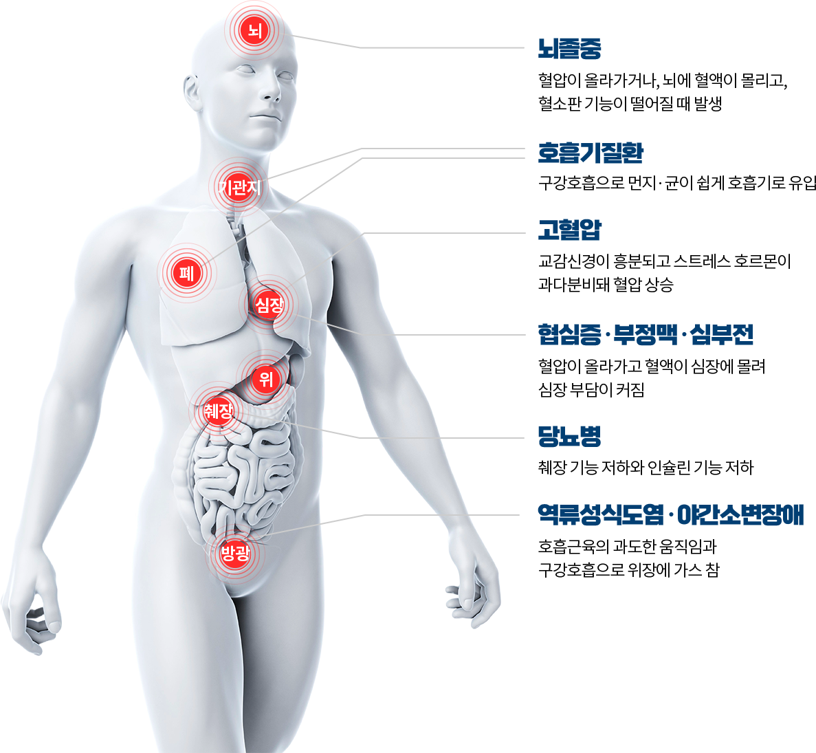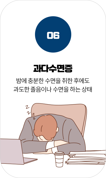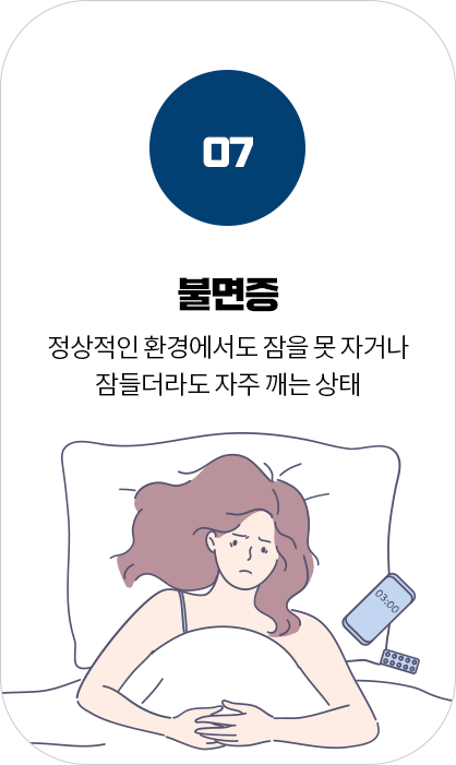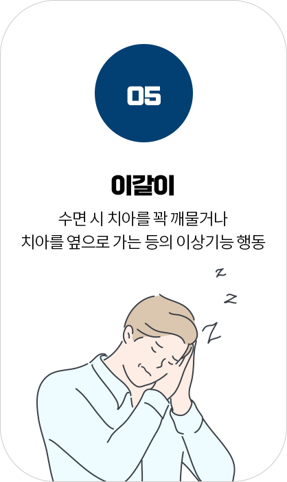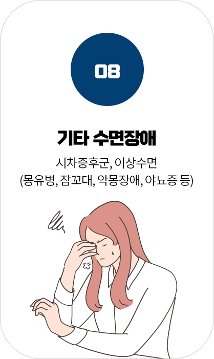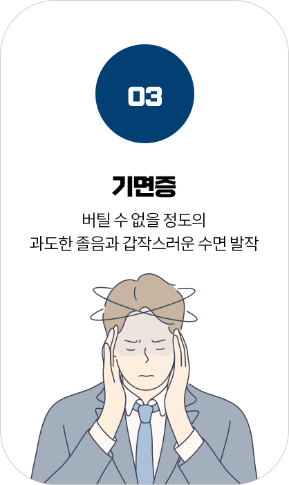 수면질환은 깊은 잠을 방해하고 수면의 질을 저하시켜 피로, 집중력 저하, 무기력 등 일상생활에 지장을 줍니다.