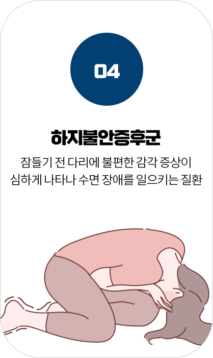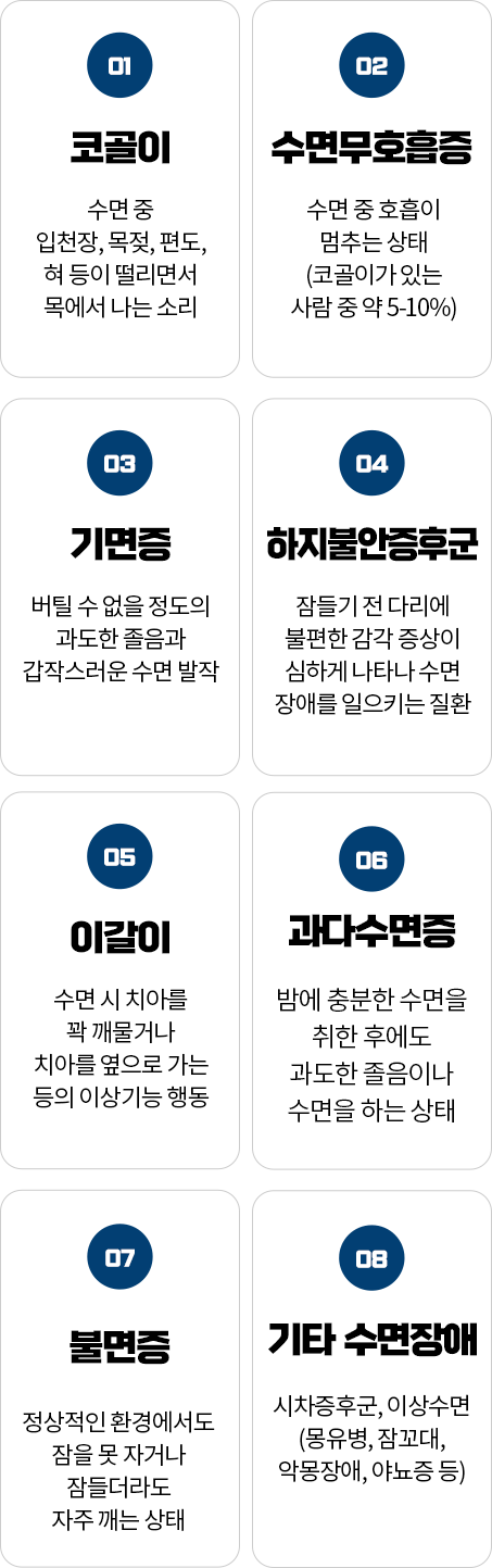 코골이, 수면무호흡증, 기면증, 하지불안증후군 등이 가장 대표적인 수면장애 질환입니다.